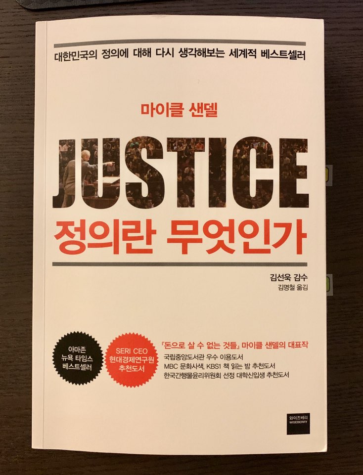 정말 잘 번역한 제목이 아닐까 싶다. '정의'라고 했다면 지루했을 것 같은 제목인데, '정의란 무엇인가'라는 질문으로 만들어 사람들이 호기심을 갖도록 만든 책. 이 책은 '정의란 무엇인가?'에 대한 답을 주는 책이 아니다. Micheal J. Sandel 교수의 목표는 정의에 대한 답을 내리는 것이 아니라, 정의가 무엇인지에 대해 다 같이 한 번 생각해 볼 기회를 만드는 것이 아닐까 싶다.